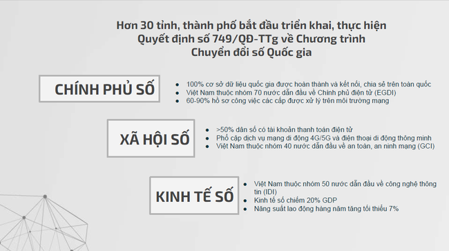 Ngày 3/6/2020, Thủ Tướng Chính phủ đã phê duyệt Chương trình Chuyển đổi số quốc gia đến 2025, định hướng 2030 và coi năm 2020 là Năm chuyển đổi số quốc gia. Quyết định nêu rõ, nhiệm vụ, giải pháp tạo nền móng chuyển đổi số là chuyển đổi nhận thức; kiến tạo thể chế; phát triển hạ tầng số; phát triển nền tảng số; tạo lập niềm tin, bảo đảm an toàn, an ninh mạng; hợp tác quốc tế, nghiên cứu, phát triển và đổi mới sáng tạo trong môi trường số. ![]() Nghị quyết số 02/NQ-CP ngày 1/1/2021 của Chính phủ tiếp tục chỉ ra 5 nhiệm vụ, giải pháp mà các bộ ngành, địa phương phải thực hiện để cải thiện môi trường kinh doanh, nâng cao năng lực cạnh tranh quốc gia trong năm 2021, trong đó có mục tiêu đẩy mạnh quá trình chuyển đổi số. |