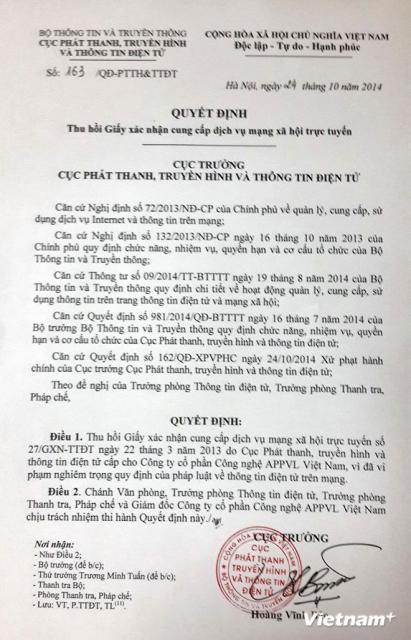 Cụ thể, Quyết định số 163/QĐ-PTTH&TTĐT thu hồi giấy xác nhận cung cấp dịch vụ mạng xã hội trực tuyến số 27/GXN-TTĐT ngày 22/3/2013 do Cục Phát thanh, truyền hình và Thông tin điện tử cấp cho Công ty cổ phần Công nghệ APPVL Việt Nam, vì đã vi phạm nghiêm trọng quy định của pháp luật về thông tin điện tử trên mạng.