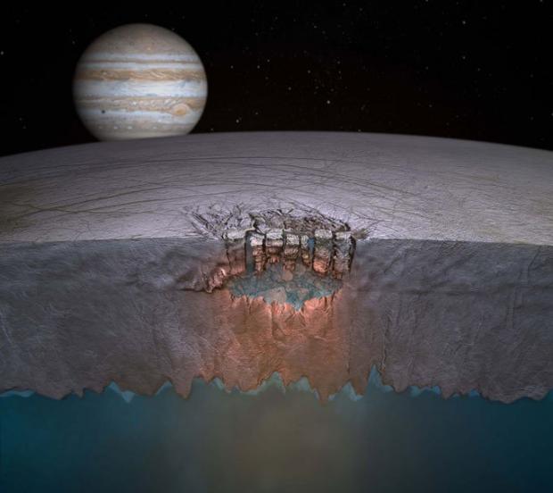 Điều đó cho thấy rằng, bên dưới bề mặt của Europa là một đại dương ngầm khổng lồ, và lượng nước này đã theo các ven địa nhiệt vọt thẳng lên không trung.