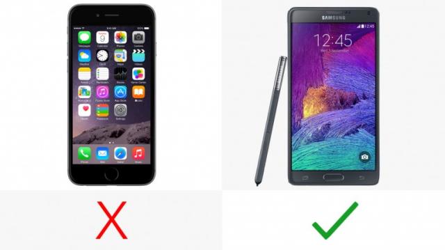 Dù lớn hơn 0.2 inch, Note 4 lại ngắn hơn iPhone 6 Plus, tỉ lệ màn hình trên điện thoại là 74% trong khi iPhone 6 Plus lại có viền trên, dưới rộng hơn, khiến tỉ lệ giảm còn 68%.