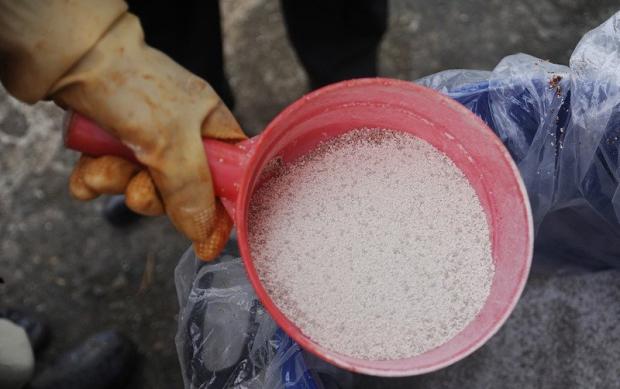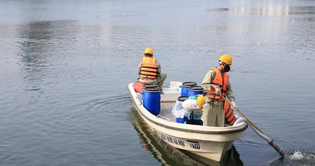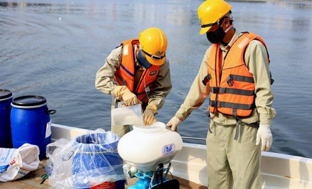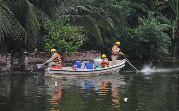 Công nhân Công ty Thoát nước Hà Nội kiểm tra các thiết bị và đổ chế phẩm vào máy sục, chế phẩm này sẽ được hòa tan và sục thẳng xuống lòng hồ. Hiện tại, chế phẩm này đã được thử nghiệm ở 22 hồ, ao của Hà Nội.