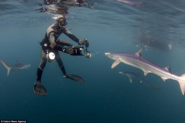 Cá mập xanh thường được gọi là 'sói biển' vì chúng đi theo bầy. Tổng cộng có 6 con cá mập xanh bơi quanh Saeed và chúng không hề sợ hãi. Dần dần, 6 con tăng lên thành 15 con và chúng thản nhiên săn mồi mà không để ý tới đội nhiếp ảnh gia bơi gần đó.