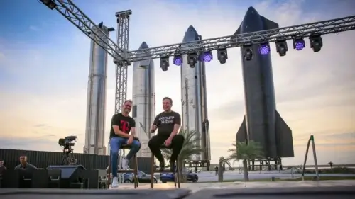 Giám đốc điều hành T-Mobile Mike Sievert (bên trái) và nhà sáng lập SpaceX Elon Musk trò chuyện tại cơ sở SpaceX ở Boca Chica, Texas (Mỹ).