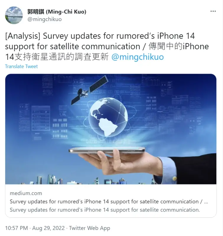 Ming-Chi Kuo cho biết Apple có hỗ trợ phần cứng cho kết nối vệ tinh, nhưng dòng iPhone 14 / Pro có hỗ trợ truyền thông qua vệ tinh hay không phụ thuộc vào “liệu Apple và các nhà mạng có thể tìm ra mô hình kinh doanh hay không ? IPhone 13 / Proline của Apple cũng có phần cứng vệ tinh nhưng không có khả năng kết nối vì “mô hình kinh doanh chưa được đưa ra.