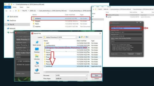 - Bước 3: Tại mục Look in bạn hãy chọn tới đường dẫn C:\Program Files\Adobe\Adobe Photoshop CC 2018. Sau đó nhấn vào file amtlib.dll và chọn Open. Sau khi hoàn tất trên màn hình sẽ hiện thông báo nhé!