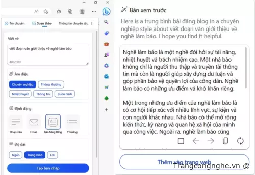 Ngoài chức năng chatbot, người dùng cũng có thể yêu cầu ChatGPT trên Bing hỗ trợ viết email, soạn thảo bài đăng hoặc bài viết trên blog… để sử dụng chức năng này, bạn chọn tab 'Soạn thảo'. Tại giao diện hiện ra, bạn điền yêu cầu cần soạn thảo vào khung 'Viết về', chọn kiểu âm điệu, kiểu bài viết (đoạn văn, email hay bài đăng blog…), độ dài của bài viết, sau đó nhấn nút 'Tạo bản nháp'.