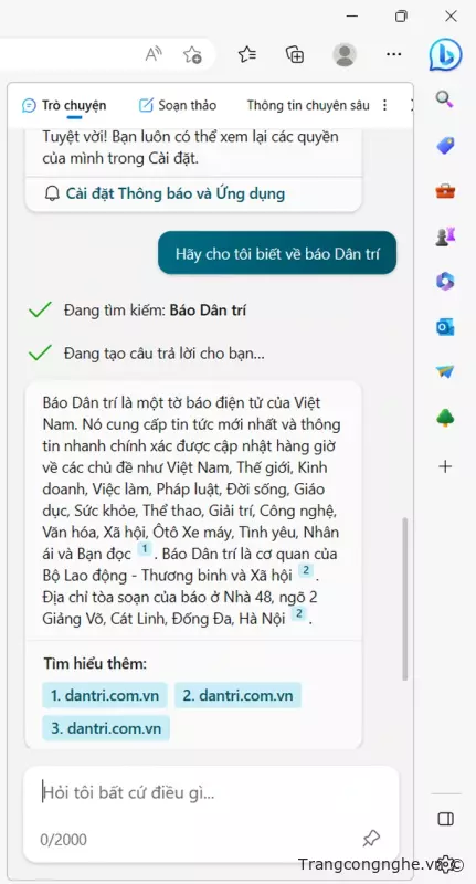 Trò chuyện, thực hiện tìm kiếm, tóm tắt trang web, soạn thảo nội dung, tìm các tài nguyên liên quan và hơn thế nữa từ thanh bên của trình duyệt