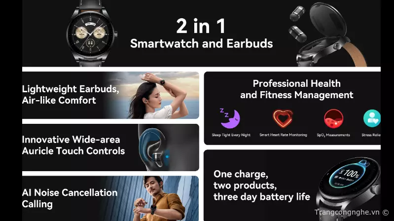 Kích thước tai nghe của Huawei Watch Buds nhỏ hơn 50% và tiết kiệm không gian đáng kể lên tới 90% so với tai nghe truyền thống. Tai nghe này có khả năng chống ồn, tích hợp công nghệ nhận dạng thích ứng tiên tiến, điều khiển cảm ứng, chất lượng âm thanh tuyệt vời và còn kháng nước với chuẩn IP54. Điều đặc biệt là mẫu tai nghe này được trang bị hai mic chống ồn chủ động và công nghệ trí tuệ nhân tạo AI để phân biệt âm vang giọng nói trong cơ thể của người dùng với tiếng ồn xung quanh, giúp loại bỏ tạp âm trong cuộc gọi và đảm bảo chất lượng cuộc đàm thoại.