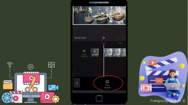 Chọn “Dự án mới” > Ấn “Thêm” > Tìm và nhấn “Lớp phủ” > Chọn “Thêm lớp phủ” > Lựa chọn video cần chèn và nhấn “Thêm” > Di chuyển và thêm hiệu ứng > Lưu video của bạn.
