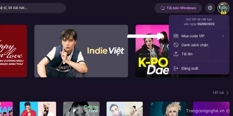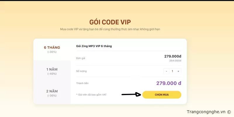 Bước 3: Nhấp vào biểu tượng của mình ở góc trên bên phải của trang web, chọn 'Zing VIP' và nhấn nút 'Mua code VIP'.