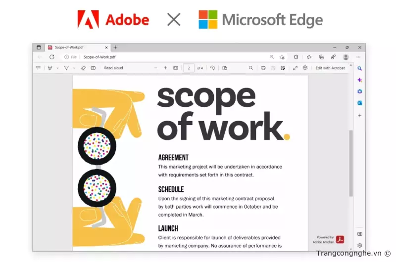 Microsoft Edge sẽ không chỉ được cải tiến bằng công nghệ AI; động cơ xử lý PDF của Adobe Acrobat cũng sẽ được tích hợp trực tiếp vào trình duyệt, thay thế cho trình đọc PDF hiện tại. Adobe cho biết thay đổi này sẽ mang lại độ chính xác màu sắc và đồ họa tốt hơn trong tài liệu, hiệu suất được cải thiện và bảo mật tốt hơn.