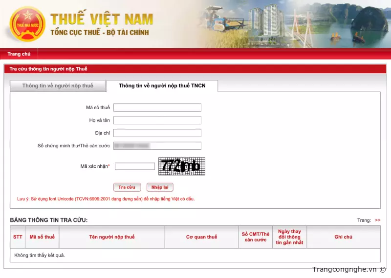 Bước 2: Trên trang web, chọn mục 'Thông tin về người nộp thuế TNCN'. Sau đó, nhập số căn cước công dân của bạn và mã xác nhận vào các ô tương ứng. Cuối cùng, nhấp vào nút 'Tra cứu' để tiếp tục quá trình tra cứu mã số thuế.