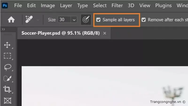 Bước 3: Sau khi đã chọn công cụ Remove Tool, hãy tích vào tùy chọn 'Sample All Layers' để tạo một layer mới trước khi bắt đầu xoá vật thể. Thao tác này cho phép bạn có một bản sao gốc của ảnh để chỉnh sửa.