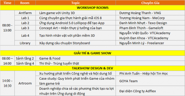 - 06 Workshops chuyên đề cập nhật Ứng dụng lập trình mới: IOS 8, Android 5.0, Unity 3D và kỹ năng tạo hình, thiết kế chuyên nghiệp.