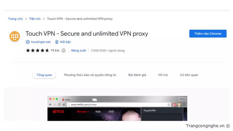 Bước 1: Để đổi địa chỉ IP máy tính, bạn cần tải tiện ích VPN cho Chrome. Bạn gõ từ khóa “Touch VPN” vào ô tìm kiếm sau đó bấm “Thêm vào Chrome”. Bạn có thể sử dụng Touch VPN, Free VPN hay bất kỳ tiện ích VPN nào khác.