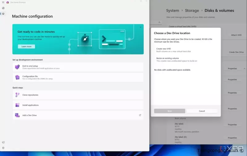 Thêm vào đó, bạn cũng có thể truy cập vào Dev Drive từ Dev Home. Dev Drive là một định dạng ổ đĩa độc đáo được thiết kế đặc biệt để lưu trữ mã nguồn và dữ liệu dự án. Nó được xây dựng dựa trên hệ thống tệp ReFS thay vì NTFS, cho phép sử dụng các tính năng như liên kết Copy-on-Write và các tối ưu hoá khác từ ReFS. Điều này giúp cải thiện hiệu suất khi xây dựng ứng dụng.