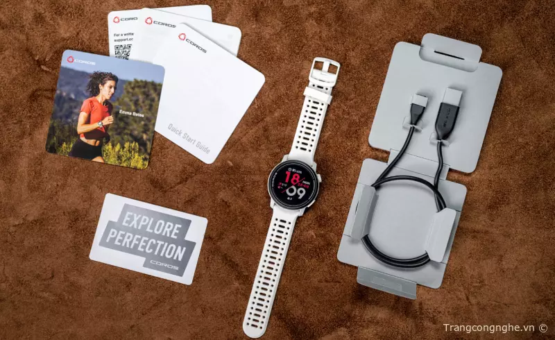Bên cạnh Coros Pace 3, bạn cũng sẽ nhận được cáp sạc, sách hướng dẫn sử dụng nhanh và một số sticker Coros.