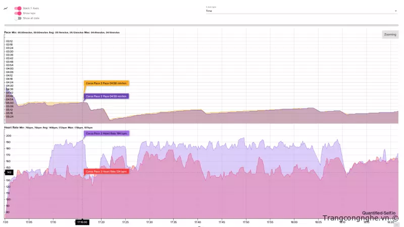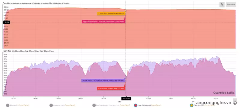 Hình này so sánh kết quả đo tim giữa Pace 3 và đai tim Polar H10, khá tương đồng nhau.