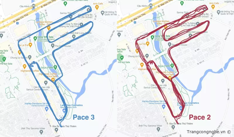 Nhờ chip GPS mới mà độ chính xác của dữ liệu ghi được cao hơn rất nhiều. Hình này là so sánh dữ liệu GPS bài chạy đồng thời của Pace 3 và Pace 2. Các bạn có thể thấy ở những khúc cua, đường hẹp và đường khuất thì tín hiệu của Pace 3 vẫn ổn định và bám sát đường.