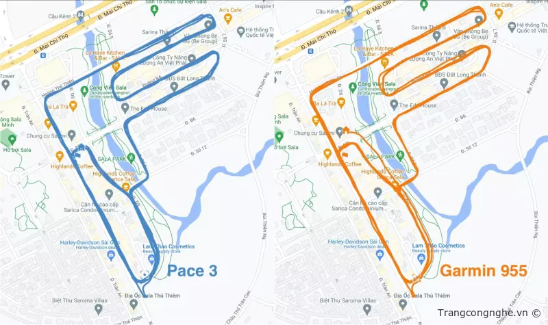 Hình này là so sánh dữ liệu GPS bài chạy đồng thời của Pace 3 và Garmin Forunner 955. Pace 3 tỏ ra ổn định hơn từ đầu tới cuối trong khi 955 mất một khoảng thời gian đầu để tín hiệu GPS được ổn định.