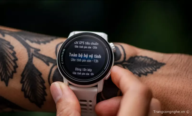 Tuy nhiên mình khuyên anh em nếu không đi thi đấu cự ly dài mà chỉ dùng để tập thì nên kích hoạt chế độ tất cả vệ tinh và băng tần kép để giúp có chất lượng GPS tốt nhất. Ở chế độ này Pace 3 sẽ tiêu tốn khoảng 6 – 7% pin cho 1 tiếng sử dụng, tương đương dùng được 14 tiếng liên tục.