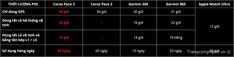 Bảng so sánh thời lượng sử dụng pin của Pace 3 với một vài đồng hồ GPS phổ biến khác.