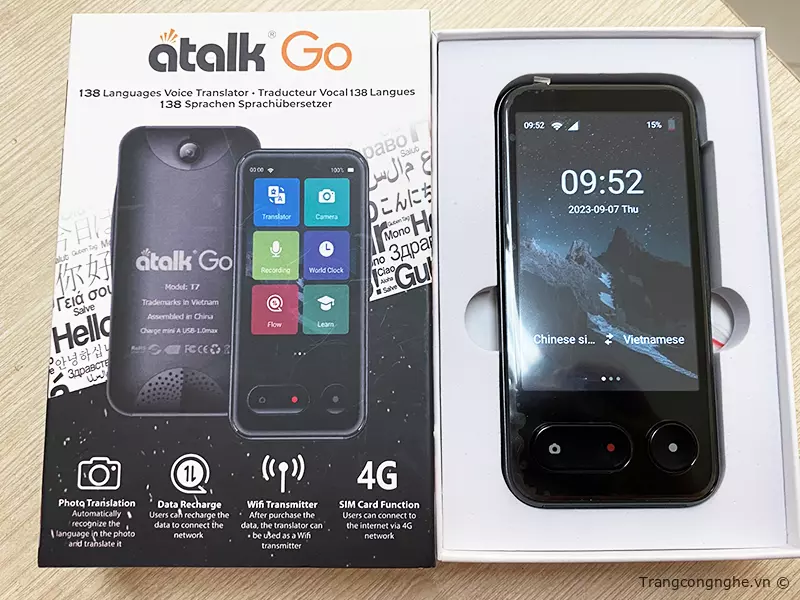 Atalk Go - dòng máy dịch thuật phổ thông, hỗ trợ người dùng dịch giọng nói tức thời và học ngoại ngữ hiệu quả qua 3 chức năng dịch ngôn ngữ: Dịch giọng nói, Dịch hình ảnh, Dịch ghi âm. Atalk Go cho phép dịch 2 chiều qua lại đến 138 ngôn ngữ nhanh chóng và ghi được câu nói dài đến 30 giây.