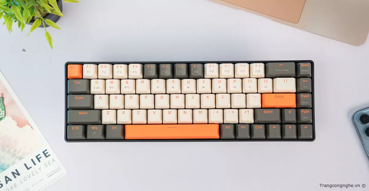 ZIYOULANG K68 có thiết kế bố cục 65%, loại bỏ hoàn toàn các phím không cần thiết như hàng phím chức năng Fn, dãy phím số Numpad và chỉ giữ lại các phím cần thiết. Điều này giúp bàn phím trở nên nhỏ gọn và tiện lợi. Bạn có thể dễ dàng đặt chiếc bàn phím này trong ba lô, mang đi làm vào ban ngày và mang về nhà vào ban đêm.