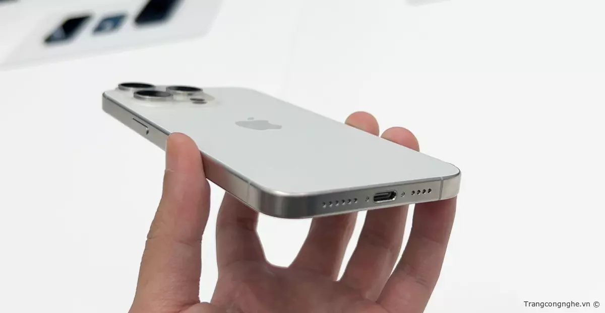 iPhone 15 Pro Max đã trang bị cổng sạc USB-C, đánh dấu một bước tiến quan trọng sau 10 năm Apple sử dụng cổng Lightning. USB-C được xem là chuẩn sạc mới hơn, mang lại tính thực dụng cao hơn cho người dùng. Với cổng USB-C, người dùng có thể dễ dàng đồng bộ hóa các thiết bị trong hệ sinh thái Apple chỉ bằng một sợi cáp duy nhất. Ví dụ, họ có thể sử dụng cùng một cáp để sạc iPhone, iPad và MacBook trên bàn làm việc, tiện lợi và tiết kiệm không gian.