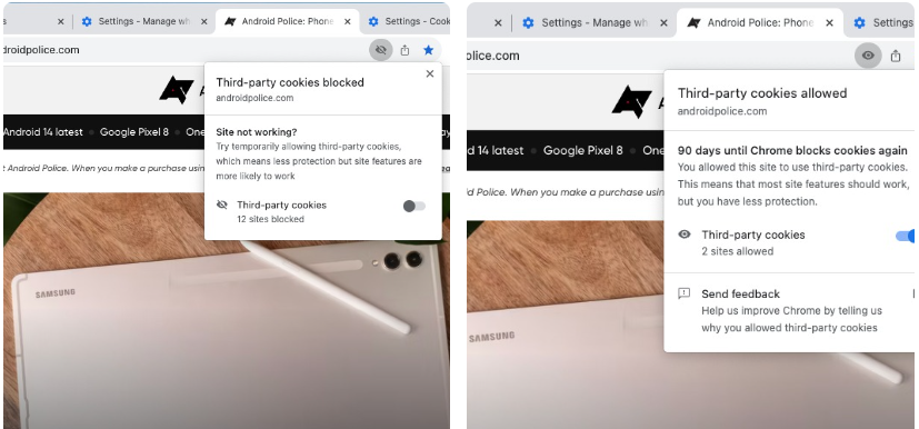 Mặc dù Google và các trình duyệt khác đang nỗ lực loại bỏ cookie của bên thứ ba, nhưng vẫn có một số trang web phụ thuộc vào cookie này để cung cấp các chức năng cốt lõi. Trên phiên bản Chrome 117, nếu người dùng truy cập vào một trang web sử dụng cookie của bên thứ ba, trình duyệt sẽ cho phép người dùng tạm thời bật cookie này và tự động tắt nó sau 90 ngày.