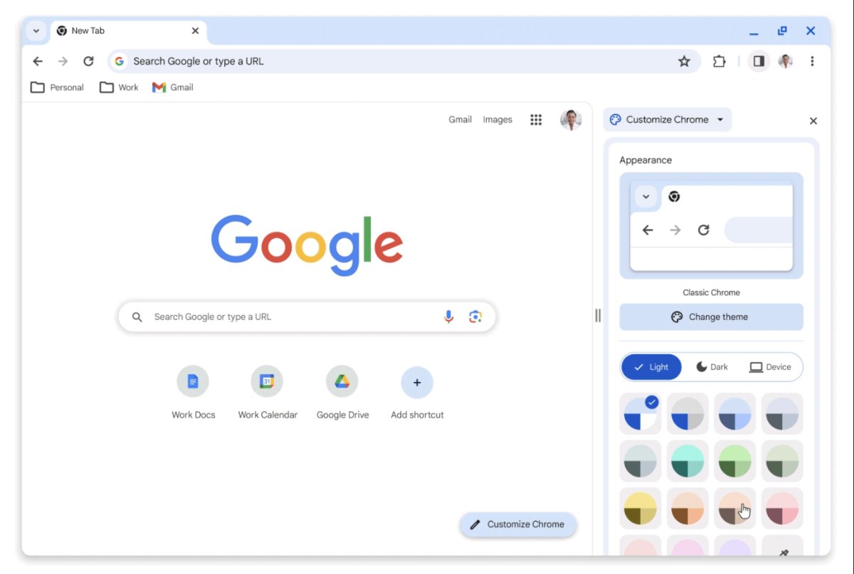 Phiên bản Chrome 117 đã áp dụng ngôn ngữ thiết kế Material You vào trình duyệt của Google. Với Material You, người dùng có thể lựa chọn giữa các chủ đề màu sắc khác nhau, tương tự như trên các dòng điện thoại Google Pixel. Giao diện mới cải thiện tính thẩm mỹ và tăng cường trải nghiệm người dùng. Đặc biệt, thanh đầu trang và menu của trình duyệt được thiết kế đẹp mắt và dễ sử dụng hơn. Thanh menu đã được sắp xếp một cách rõ ràng, với các mục cài đặt tài khoản được tách riêng để tăng tính trực quan, và các biểu tượng được bổ sung để giúp người dùng dễ dàng nhận diện các mục trong menu.