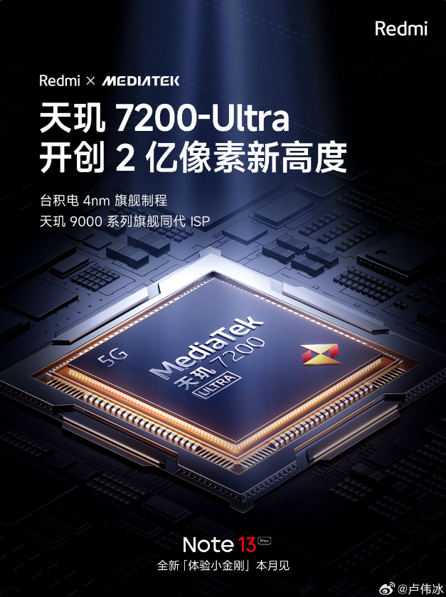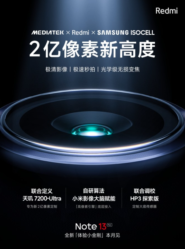 Theo những tấm poster của Xiaomi, Redmi Note 13 Pro+ sẽ được trang bị con chip Dimensity 7200 Ultra của MediaTek và cảm biến camera Samsung ISOCELL HP3 200MP với khẩu độ f/1.65. Cảm biến 200MP này đã được sử dụng trên mẫu Redmi Note 12 Pro+ trước đây, cho phép Redmi Note 13 Pro+ tiếp tục sử dụng công nghệ chống rung OIS và EIS để quay video chất lượng cao hơn.