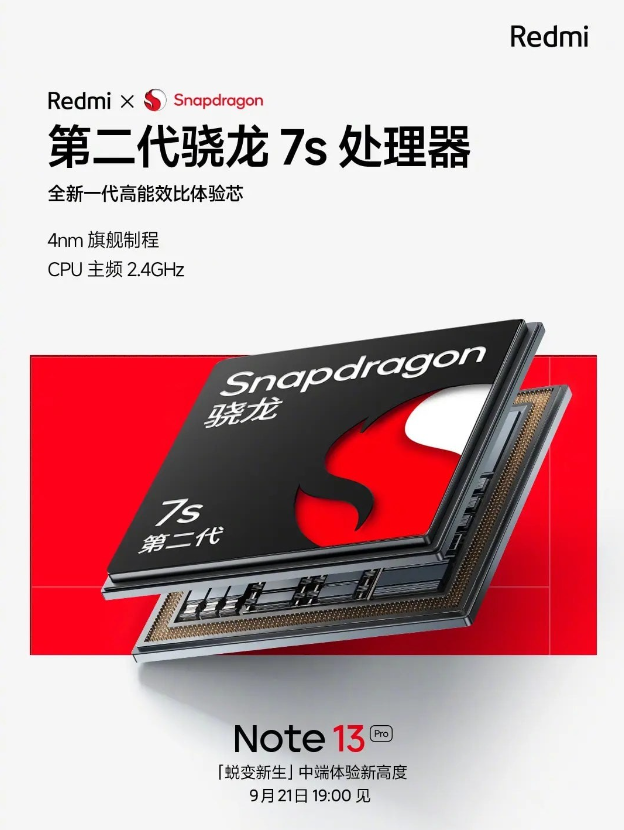 Redmi Note 13 Pro sẽ được trang bị con chip Snapdragon 7s Gen 2 - con chip mới nhất từ Qualcomm. Mặt trước của máy có thông số màn hình tương tự như bản Pro+, nhưng không có đường cong. Vẫn là màn hình AMOLED với độ phân giải 1,5K và độ sáng tối đa 1800 nits, hỗ trợ cảm biến vân tay trong màn hình và đạt chứng nhận TUV Rheinland. Mặt sau của Redmi Note 13 Pro được làm bằng kính và cũng có cụm 3 camera. Máy cũng được trang bị cảm biến 200MP tương tự như bản Pro+, nhưng sẽ không hỗ trợ công nghệ chống rung quang học OIS.