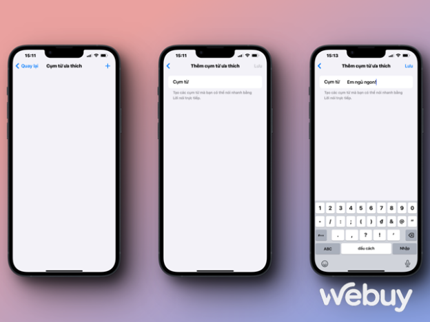 Tiếp tục nhấn vào dòng 'Cụm từ ưa thích' và nhấn tiếp vào dấu '+'. Trong giao diện 'Thêm cụm tử ưa thích’, bạn hãy nhập một cụm từ ngắn mà bạn thích và sử dụng thường xuyên, sau đó lưu lại.