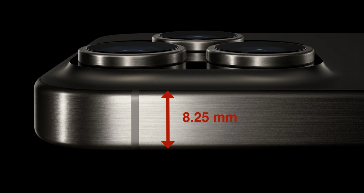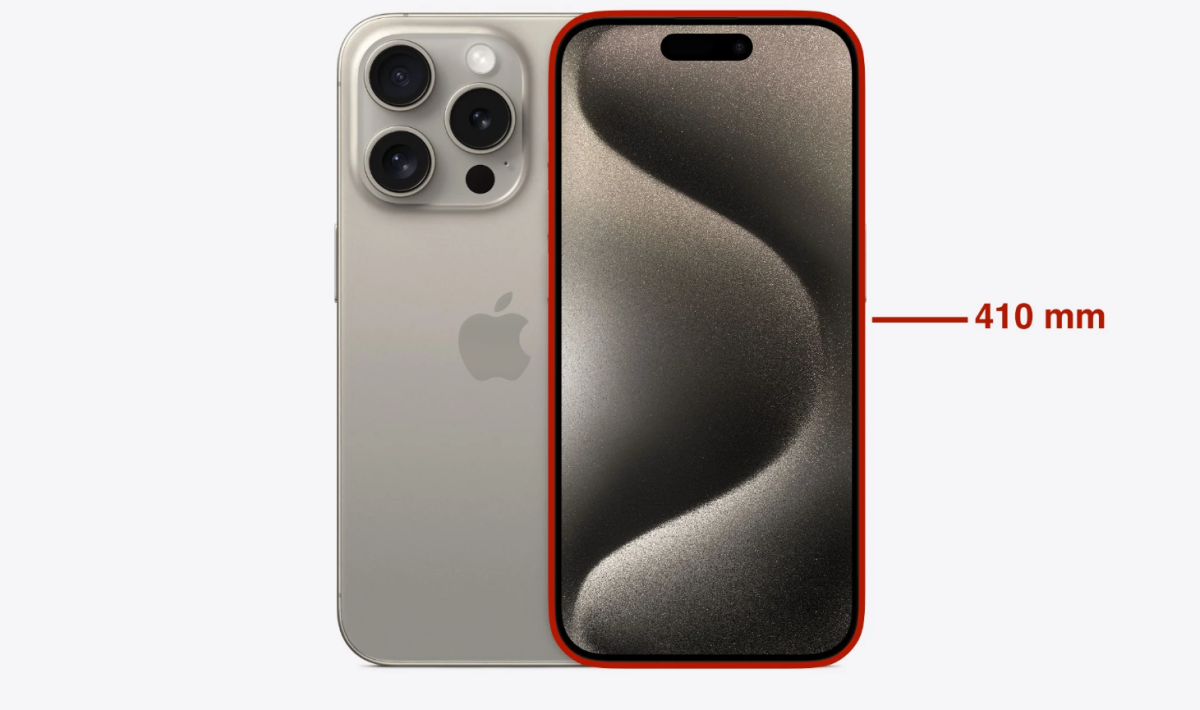 Lấy số Chu vi ở trên nhân với thông số Độ dày của iPhone 15 Pro ta sẽ được diện tích bề mặt phần khung viền là: 410 x 8.25 = 3382.5 mm2.