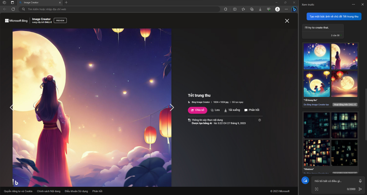 Khi bạn nhấp vào một ảnh tạo bởi Copilot, nó sẽ mở trình duyệt Edge và hiển thị thông tin liên quan đến hình ảnh đó. Bạn có thể chia sẻ, lưu trữ hoặc tải xuống những bức ảnh này theo mong muốn của mình.