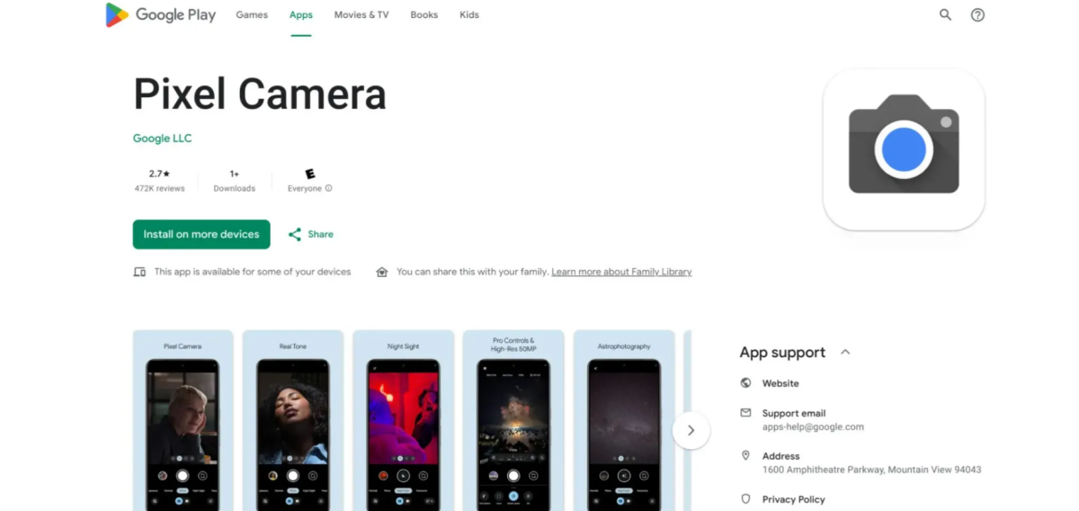 Hiện nay, khi người dùng truy cập vào ứng dụng Pixel Camera trên Google Play Store, mô tả đã được thay đổi thành: 'Không bỏ lỡ bất kỳ khoảnh khắc nào với Pixel Camera được thiết kế lại hoàn toàn. Bạn có thể chụp ảnh và quay video tuyệt đẹp với các tính năng như Chế độ Chân dung, Chế độ ban đêm, Tua nhanh thời gian và Làm mờ kiểu điện ảnh'.
