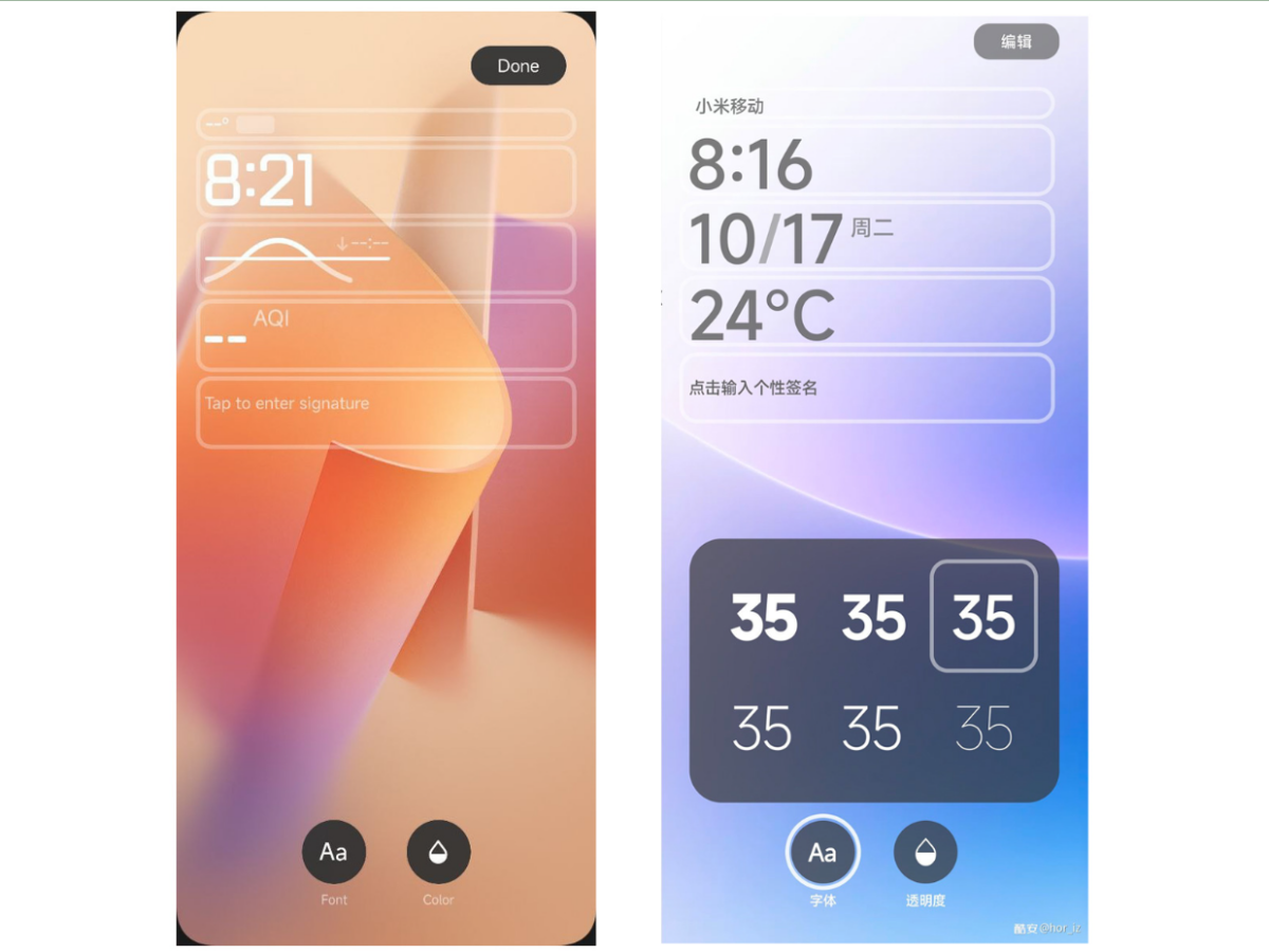 HyperOS có một số thay đổi đáng chú ý. Giao diện màn hình khoá đã được nâng cấp mạnh mẽ. Tương tự với Android 14, người dùng có thể thay đổi kiểu đồng hồ, font chữ và màu sắc trực tiếp trên màn hình khoá. Các mặt đồng hồ mới cũng được thiết kế trực quan, đẹp mắt và nổi bật hơn so với thiết kế trước đây trên MIUI 14. Hơn nữa, người dùng còn có thể theo dõi tốc độ sạc trực tiếp trên màn hình khoá, với các thông số chi tiết như cường độ dòng điện, hiệu điện thế và tổng công suất.