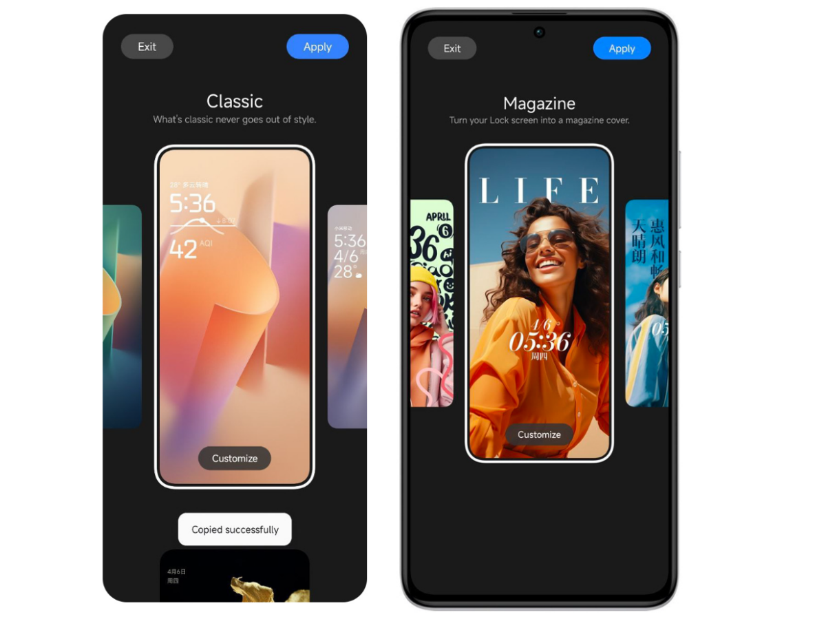 HyperOS cũng giới thiệu tính năng mới được gọi là Magazine. Tính năng này cho phép người dùng tùy chỉnh màn hình khoá để trông giống như bìa một trang tạp chí. Khu vực đồng hồ được đặt chính giữa, trong khi hình nền và các dòng chữ được bố trí một cách hài hòa và thuận mắt nhất. Điều này mang lại cho người dùng trải nghiệm màn hình khoá độc đáo và hấp dẫn hơn trên HyperOS.
