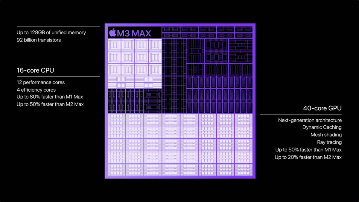 Trong sự kiện 'Scary Fast', Apple đã ra mắt bộ ba bộ xử lý mới cho dòng máy Mac gồm Apple M3, Apple M3 Pro và Apple M3 Max, với hiệu năng vượt trội. Tất cả các thành phần của chip mới đều sử dụng công nghệ 3nm nhằm tăng cường hiệu suất. GPU của chúng đã được cải tiến với một bước nhảy vọt lớn về kiến trúc đồ họa, mang lại những tiến bộ đáng kể cho Apple Silicon. Ngoài ra, vi kiến trúc mới còn đem lại tính năng đột phá được gọi là Dynamic Caching.