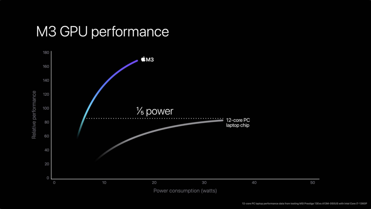 Apple đã đưa ra những thông tin đáng chú ý về hiệu quả năng lượng của dòng sản phẩm Apple M3 mới. So với các laptop sử dụng CPU 12 nhân (như Intel P-series, ví dụ), Apple M3 chỉ sử dụng khoảng 1/4 năng lượng cho CPU và 1/5 năng lượng cho GPU, nhưng vẫn đảm bảo hiệu năng tương đương. Kết quả là các mẫu MacBook mới được trang bị dòng CPU này có thời lượng pin lên đến 22 giờ và hiệu suất không bị ảnh hưởng khi không kết nối sạc điện.