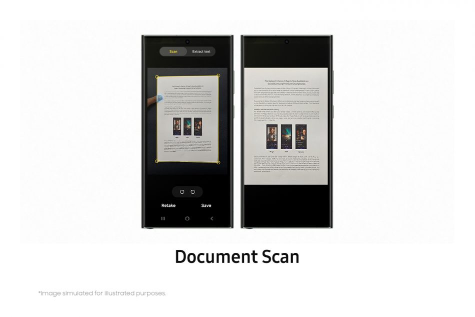 Với tính năng Quét tài liệu được hỗ trợ bởi trí tuệ nhân tạo (AI) trên One UI 6.0, người dùng có thể dễ dàng chụp và lưu tài liệu. Khi chụp ảnh tài liệu, tính năng này sẽ tự động mở màn hình chỉnh sửa, giúp người dùng xoay, căn chỉnh và lưu ảnh một cách nhanh chóng. Đáng chú ý, tính năng này còn có khả năng tự động nhận dạng và loại bỏ ngón tay xuất hiện trong ảnh. Người dùng cũng có thể kết hợp tính năng Quét tài liệu với ứng dụng Enhance-X để loại bỏ các vật thể không mong muốn trong tài liệu, chẳng hạn như kẹp giấy hay bút.