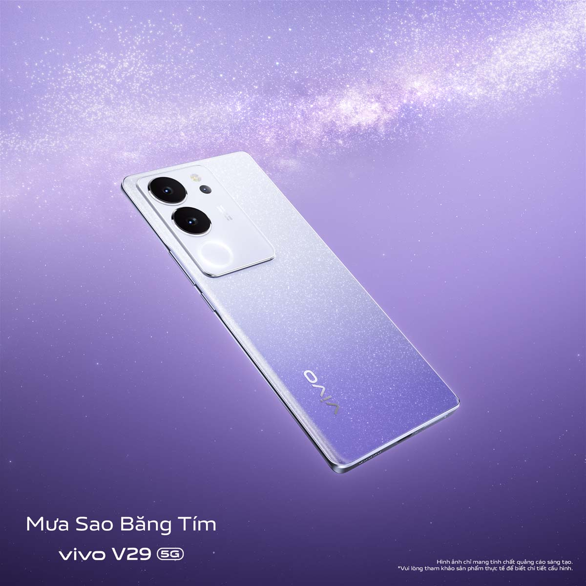 Với phiên bản V29 5G, vivo cũng giới thiệu hai màu sắc khác là Mưa Sao Băng Tím (Starry Purple) và Lụa Satin Đen (Noble Black). Màu sắc Mưa Sao Băng Tím mang đến một trải nghiệm độc đáo, với việc sử dụng công nghệ Bầu Trời Sao 3D. Công nghệ này tích hợp 9 triệu vi hạt từ tính, lấy cảm hứng từ dải ngân hà và hàng ngàn ngôi sao nhỏ, tạo nên một hiệu ứng ánh sáng đặc biệt trên bề mặt điện thoại.