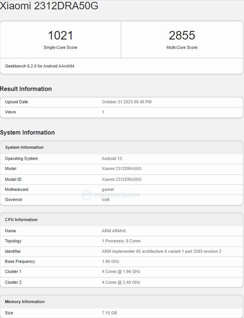 Thông qua cơ sở dữ liệu Geekbench, Redmi Note 13 Pro tiết lộ rằng điện thoại sẽ được trang bị vi xử lý 8 nhân với cấu trúc 4 + 4. Bốn nhân hiệu năng cao sẽ có tốc độ xung nhịp 2.40GHz, trong khi bốn nhân còn lại sẽ hoạt động ở tốc độ xung nhịp 1.96GHz.