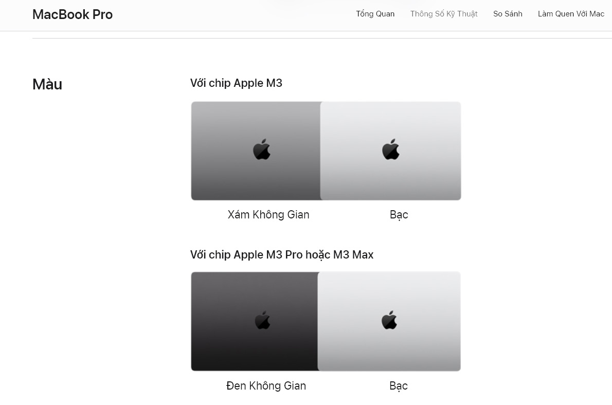 Về thiết kế tổng thể và hầu hết các yếu tố khác trên MacBook Pro 14 inch, không có thay đổi đáng kể, trừ việc Apple đã bổ sung một tùy chọn màu đen mới. Cụ thể, đối với phiên bản sử dụng chip M3, bạn vẫn có thể chọn giữa màu bạc hoặc đen. Đối với các phiên bản M3 Pro và M3 Max, bạn có tùy chọn giữa màu đen và màu bạc, không còn tùy chọn màu xám nữa.