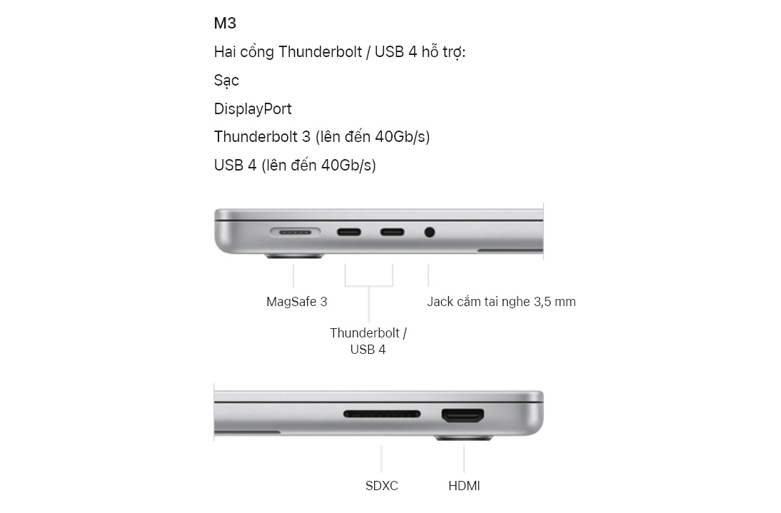 Thêm một khác biệt trên MacBook Pro 14 inch sử dụng chip M3 là sự hiện diện của chỉ 2 cổng Thunderbolt 3. Trong khi đối với tất cả các cấu hình khác, bạn sẽ tìm thấy 3 cổng Thunderbolt 4.