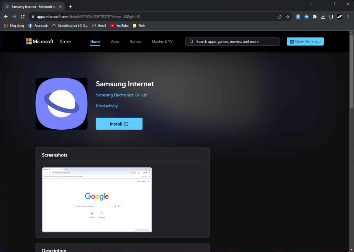 Bước 1: Sao chép đường dẫn sau và dán vào thanh địa chỉ để truy cập vào ứng dụng Samsung Internet. https://apps.microsoft.com/detail/XPDCMJG5PTR3TP?hl=en-US&gl=US