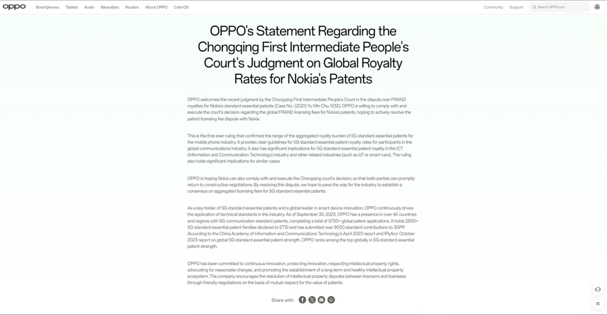 Theo thông tin từ công ty nghiên cứu thị trường IDC, doanh số bán điện thoại thông minh của OPPO đã giảm 6,5% trong quý 3/2023, tuy nhiên, OPPO vẫn duy trì vị trí là một trong những thương hiệu điện thoại lớn nhất trên toàn cầu. Với quyết định mới từ Tòa án Trùng Khánh, OPPO rõ ràng đang có ý định chấm dứt tranh chấp pháp lý với Nokia. Trước đó, vào năm 2022, OPPO đã thất bại trong một vụ kiện vi phạm bằng sáng chế với Nokia tại Đức, dẫn đến cấm bán một số sản phẩm của OPPO tại Đức và công ty đã loại bỏ toàn bộ các sản phẩm này khỏi trang web chính thức tại quốc gia này.