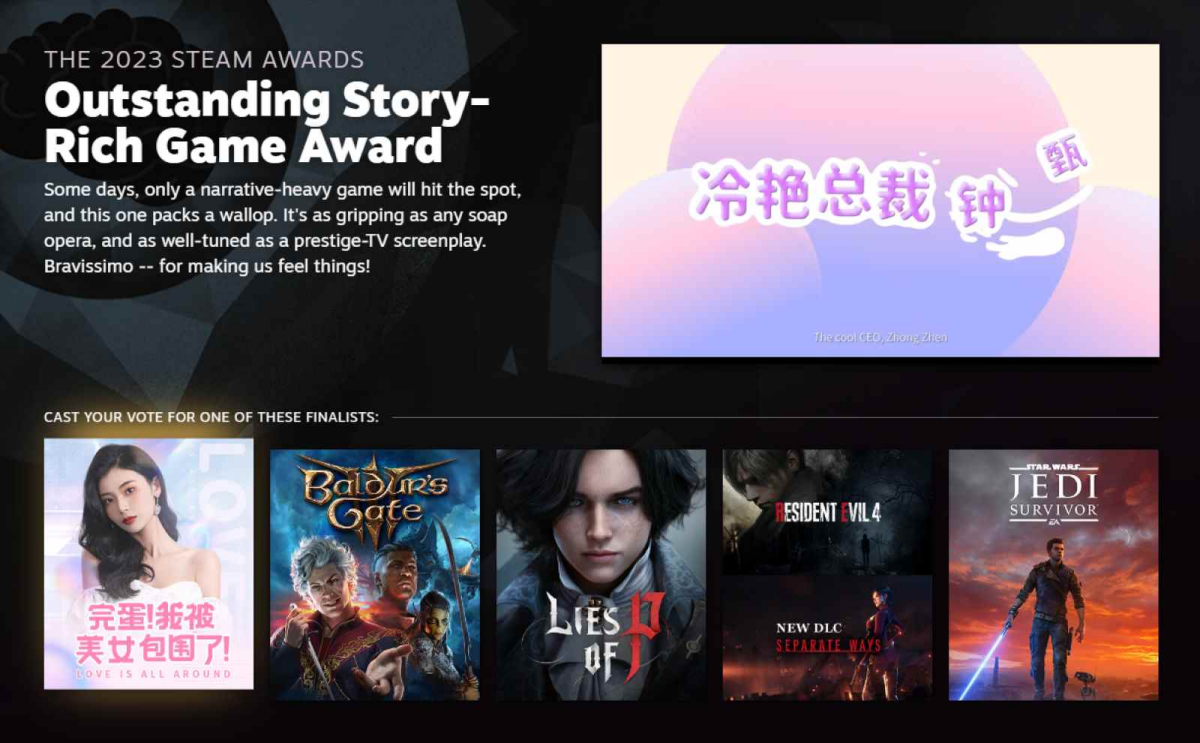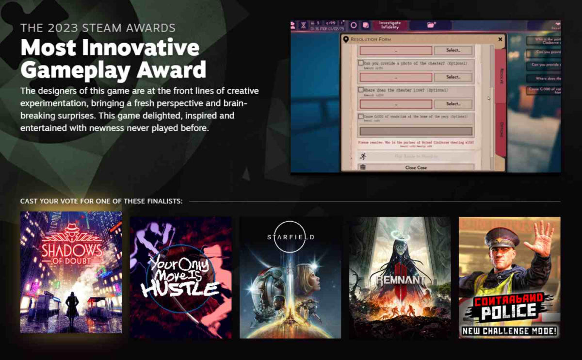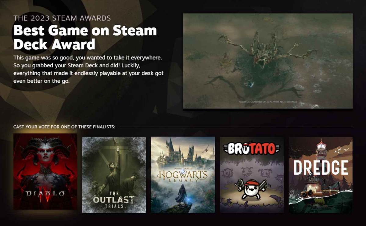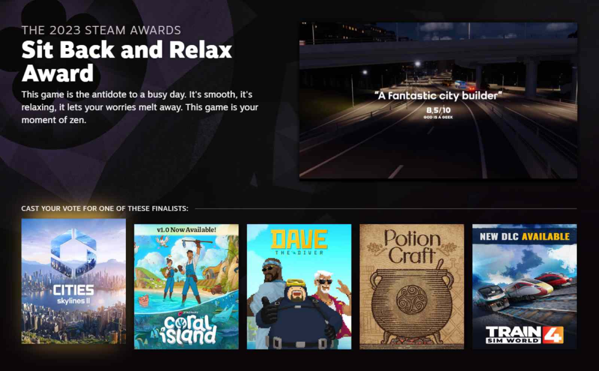 Valve vừa công bố đầy đủ danh sách đề cử cho Giải thưởng The Steam Award năm 2023. Các giải thưởng trong từng hạng mục sẽ được trao cho những tựa game có số lượt bầu chọn cao nhất.