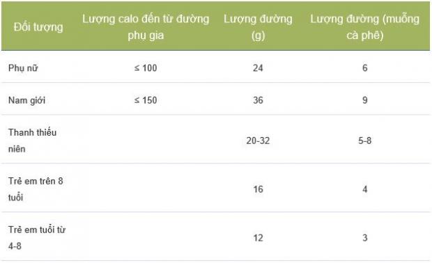 Khuyến cáo mức độ tiêu thụ đường cho từng nhóm người.